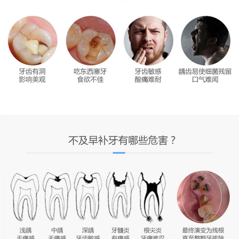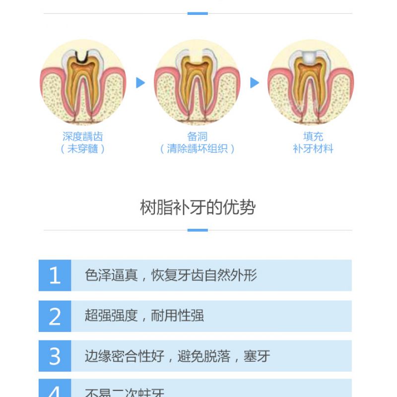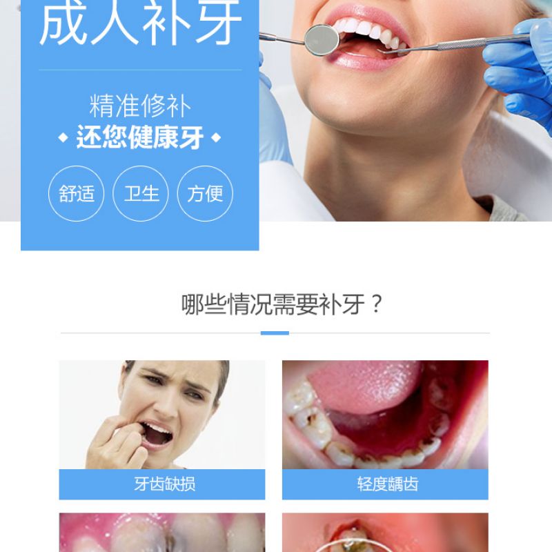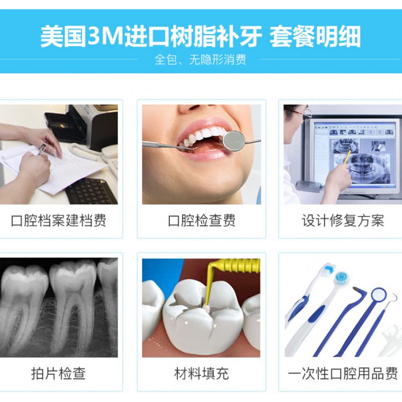 1.此套餐优惠限首颗,适用于后牙浅龋龋洞补牙,不适用于楔状缺损,前牙、智齿、深龋和复杂窝洞补牙,牙齿实际情况是否适用于此套餐,以医生面诊建议为主。